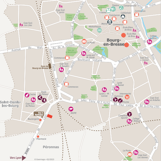Gare de Bourg-en-Bresse à 750 m desservant la gare de Lyon-Part-Dieu en 1 h ou la gare de Genève-Cornavin en 1 h 20 env.