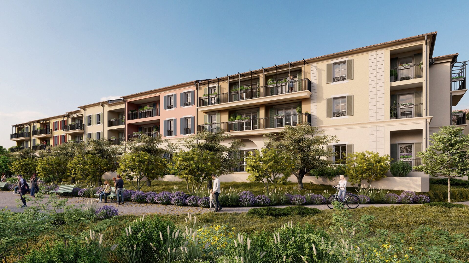 Reprenant les codes de l’habitat individuel, les petites unités résidentielles de ce programme RT 2012 reflètent une inspiration méridionale : façades nuancées de couleurs chaudes, matériaux nobles (pierre, bois, terre cuite, etc.). Leurs appartements neufs sont déclinés dans une gamme de surfaces adaptées aux différentes structures familiales. Certains d’entre eux tirent avantage d’une configuration traversante ou d’une double exposition. Tous communiquent avec un spacieux balcon, et disposent de l’agrément de 2 parcs publics paysagers avec boulodrome, aire de jeux pour enfants, espaces de détente… Le stationnement des véhicules s’effectue dans des parkings en sous-sol ou sur des places aériennes ombragées.