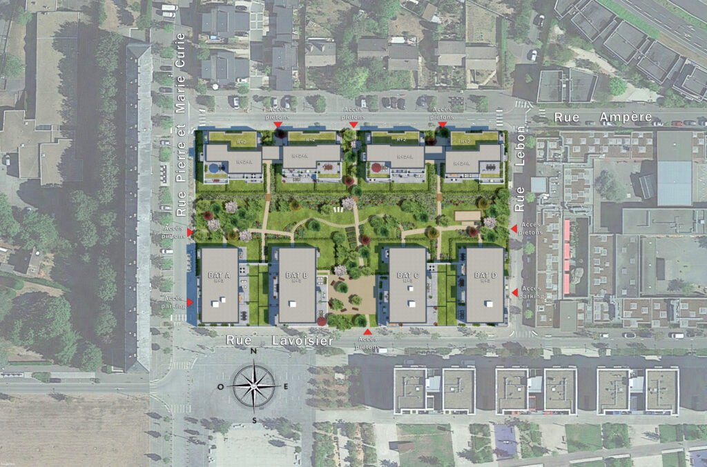 Le programme neuf Les Jardins d’Henri IV prend place dans le quartier des Clos, en pleine métamorphose, où se développent nouvelles infrastructures, commerces et espaces paysagers. Cet environnement repensé privilégie le confort et la qualité de vie avec des lignes de transport efficaces et des liaisons douces favorisant les déplacements à pied ou à vélo. À proximité immédiate, vous trouverez une boulangerie, une épicerie, une banque, une pharmacie et une future halle avec marché, tandis qu’un supermarché se situe à seulement 2,2 km. Les familles apprécieront la proximité du pôle enfance Henri IV regroupant crèche, école maternelle et école élémentaire. Côté mobilité, un arrêt de bus à 270 m permet de rejoindre le centre-ville et la gare en moins de 15 minutes. Pour les trajets en train, la gare de Chartres, à 3,5 km, dessert Paris-Montparnasse en environ 1 heure. Les automobilistes bénéficient d’un accès rapide à l’A11 situé à 5,5 km. L’environnement verdoyant est propice à la détente avec le parc des Petits Clos, le bois des Hauts de Chartres et le parc des bords de l’Eure dans un rayon de 1 km. Enfin, pour les amateurs de sport et de culture, un centre culturel, un stade, un gymnase et un complexe sportif se trouvent à proximité immédiate, tandis que la zone industrielle Edmond-Poillot est facilement accessible via une liaison piétonne. Un cadre de vie idéal combinant modernité, nature et praticité.