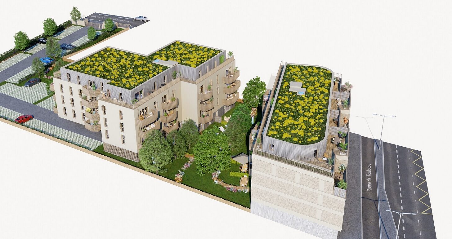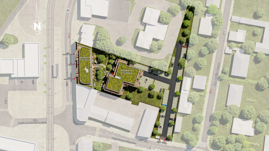 Un environnement paysager généreux complète ce cadre de vie, avec des jardins communs arborés, une toiture végétalisée et un aménagement pensé pour favoriser le confort thermique et la biodiversité.