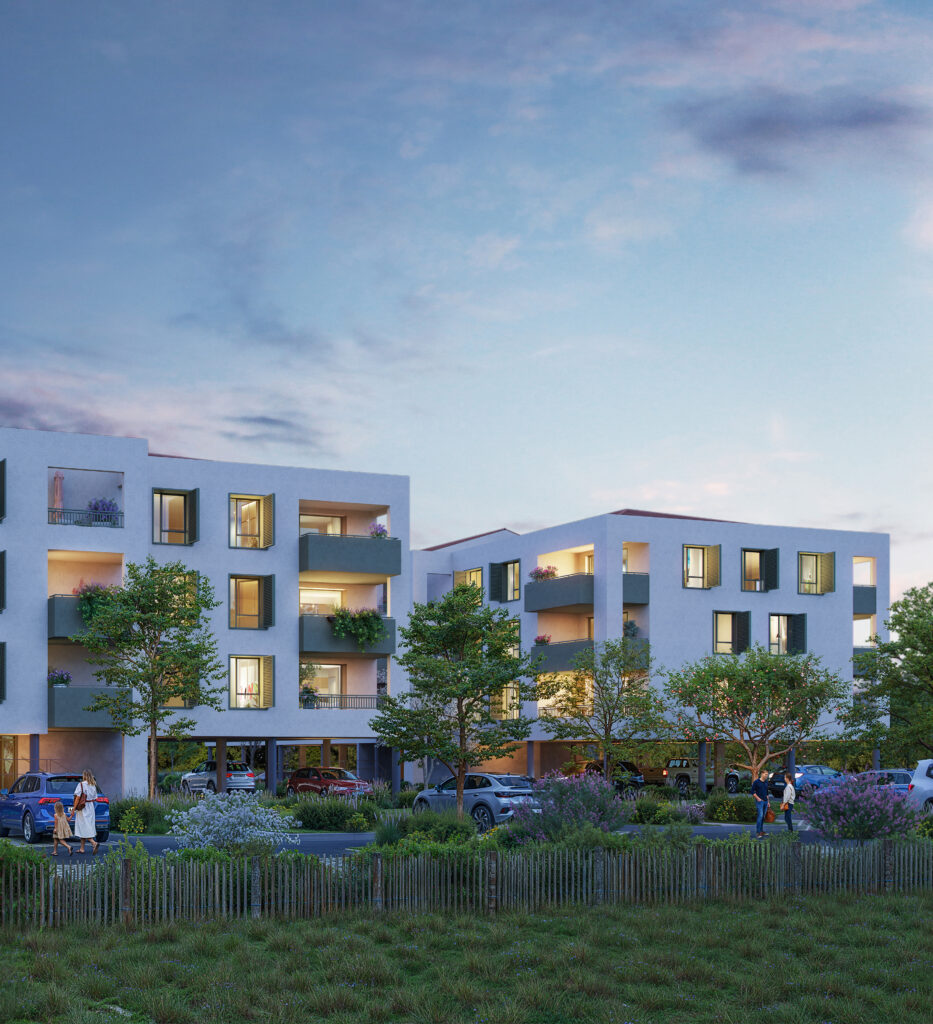 La résidence Botanika, imaginée par l’agence Colegram Architectes, se distingue par une architecture moderne et épurée. Ses deux bâtiments, aux lignes sobres et contemporaines, sont habillés d’un enduit blanc cassé qui reflète une grande légèreté visuelle. Les façades sont animées par des loggias, certaines avec des garde-corps en béton gris-vert, qui rythment l’ensemble tout en apportant une touche graphique à la composition. Le choix de l’architecture repose sur l’intégration parfaite dans le quartier, tout en offrant un cadre agréable et contemporain aux résidents.