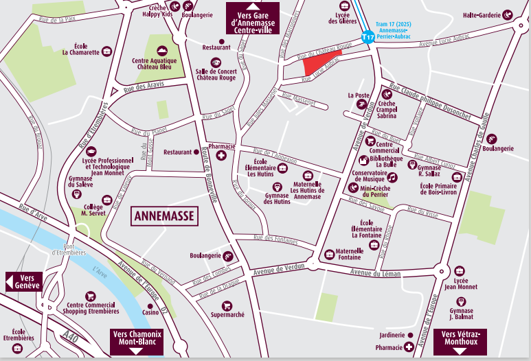 Futur tramway Annemasse – Genève à 300 m (prévu fin 2025), accès rapide à l’A40 et aux autoroutes suisses.