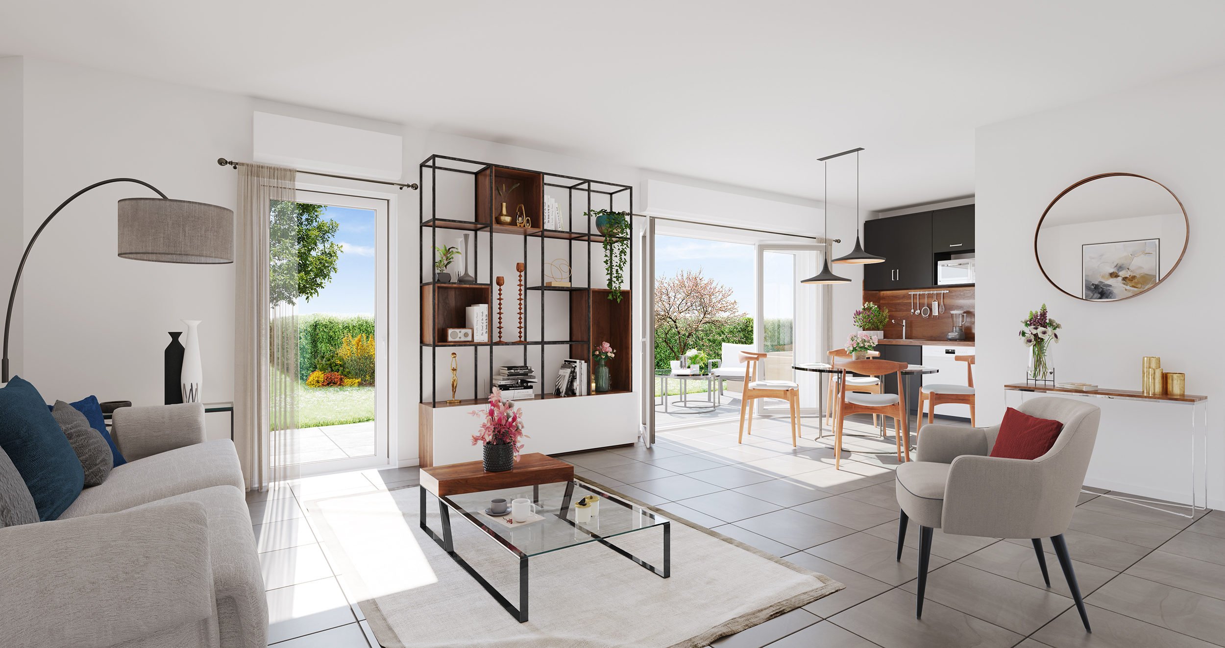 Les appartements, allant du 2 au 5 pièces, offrent des espaces lumineux, optimisés et fonctionnels. Chaque logement est prolongé par un extérieur privatif, qu’il s’agisse d’un jardin avec terrasse en rez-de-chaussée, d’une loggia ou d’un balcon. Les appartements traversants ou bi-orientés garantissent une luminosité naturelle maximale.