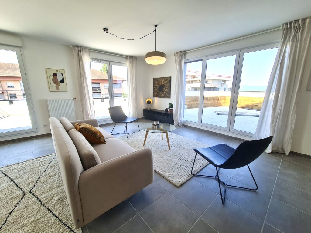 Limitrophe du quartier recherché de Concise, le programme immobilier neuf Les Jardins du Lac bénéficie d’une localisation à 12 min à pied du centre-ville et du parc du Belvédère offrant un superbe panorama sur le lac Léman. Atouts pour les actifs : bus à deux pas reliant la gare en 8 min (TER, TGV et Léman Express). Programme RT 2012 avec beaux espaces paysagers communs et vues lac pour certains logements.