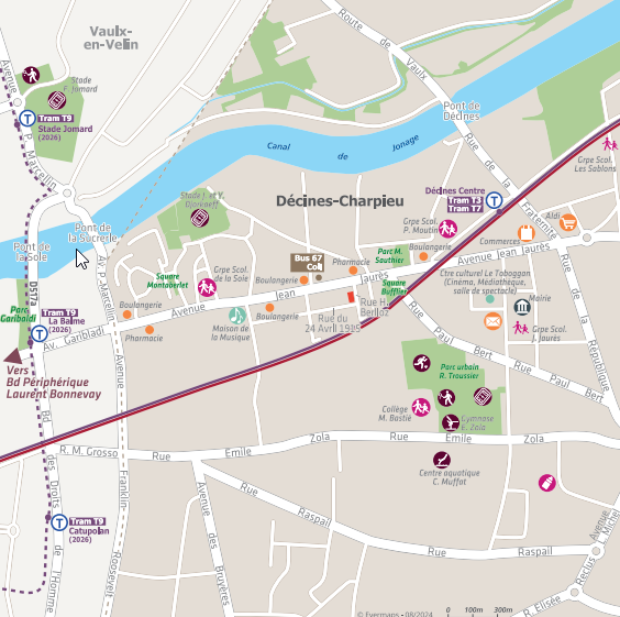 Le programme neuf Décibel vous invite à profiter d’un cadre de vie pratique et agréable, à 14 min à pied du centre-ville, à proximité de l’avenue Jean Jaurès et d’un marché. Les commerces, écoles et services sont accessibles en quelques minutes à pied ou à vélo, tandis que de beaux espaces naturels invitent à la détente. Le marché et un supermarché se trouvent dans un rayon de 900 m, avec le centre commercial Carré de Soie à seulement 7 min en bus. Les familles bénéficient d’une crèche et d’un groupe scolaire à distance piétonne, ainsi qu’un collège à 6 min à vélo. L’arrêt de bus à 290 m dessert une station du métro A en 11 min, tandis que les stations du T3 et du T7 à 900 m permettent de rejoindre Lyon Part-Dieu Villette en 18 min. L’accès à la rocade Est à 2,9 km et au périphérique Laurent Bonnevay à 3,5 km facilite les déplacements en voiture. Le parc Maurice Sauthier, situé à 300 m, offre un cadre idéal pour s’oxygéner. De nombreux équipements de loisirs, dont stades, salles de spectacles, cinéma et médiathèque, sont accessibles dans un rayon de 950 m. Enfin, la résidence bénéficie d’un accès rapide aux zones industrielles des Pivolles et de La Soie, ainsi qu’aux bassins d’emploi de Vaulx-en-Velin, dont La Rize.