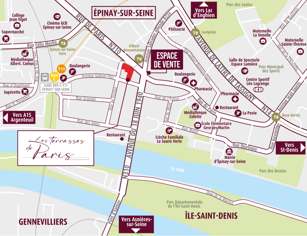 Côté transports, la mobilité est optimale avec 6 lignes de bus et une station du tramway T8 à deux pas, permettant de rejoindre Saint-Denis – Porte de Paris en 20 minutes. La résidence se trouve également à 400 mètres de la gare RER C et du T11 Express, reliant la gare d’Épinay-Villetaneuse (Transilien H) en seulement 2 minutes. Pour les déplacements en voiture, l’accès immédiat à la N310 et à la N14 (à 700 mètres) facilite les trajets vers les principaux axes routiers.