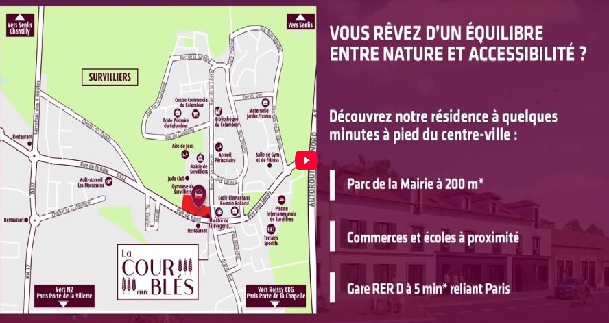 À seulement 30 km de Paris, la ville bénéficie d’une excellente accessibilité grâce à ses nombreux moyens de transport, comme l’A1, le RER D et une dizaine de lignes de bus. Vous serez également à proximité immédiate de nombreux commerces, services et écoles.
