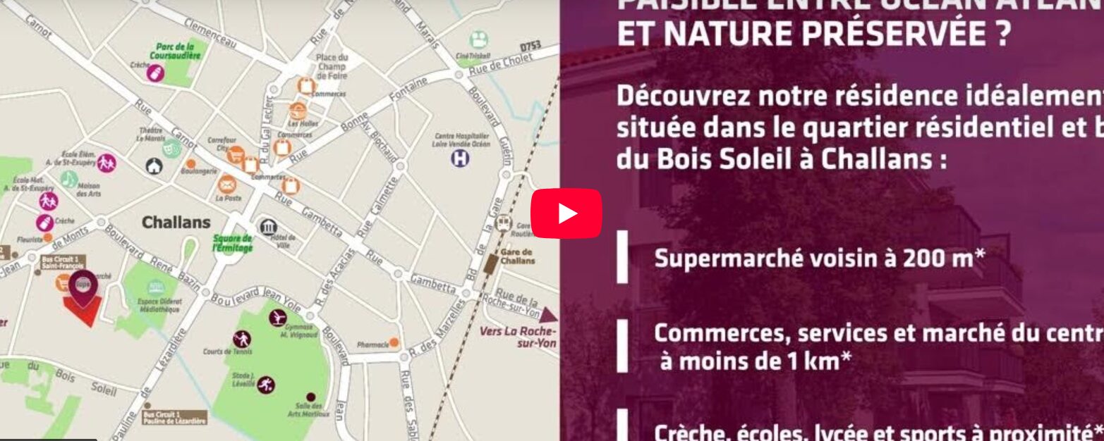 Située à l’entrée du coeur de ville de Challans, le programme immobilier du Bois Soleil vous propose des appartements neufs du studio au 3 pièces dans une résidence intimiste de deux étages dans un secteur calme, pavillonnaire et résidentiel.