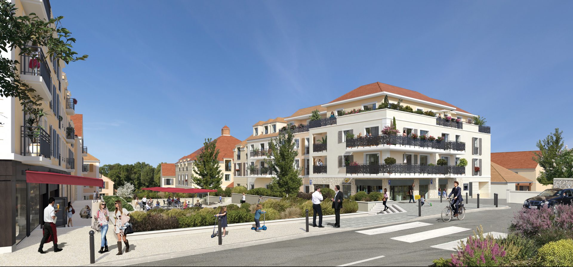 Ce projet crée un lieu de vie fort regroupant commerces, services et logements. Les résidences abritant les appartements feront face à la nouvelle place de l’hôtel de ville et les villas feront face à un verger paysager remarquable.